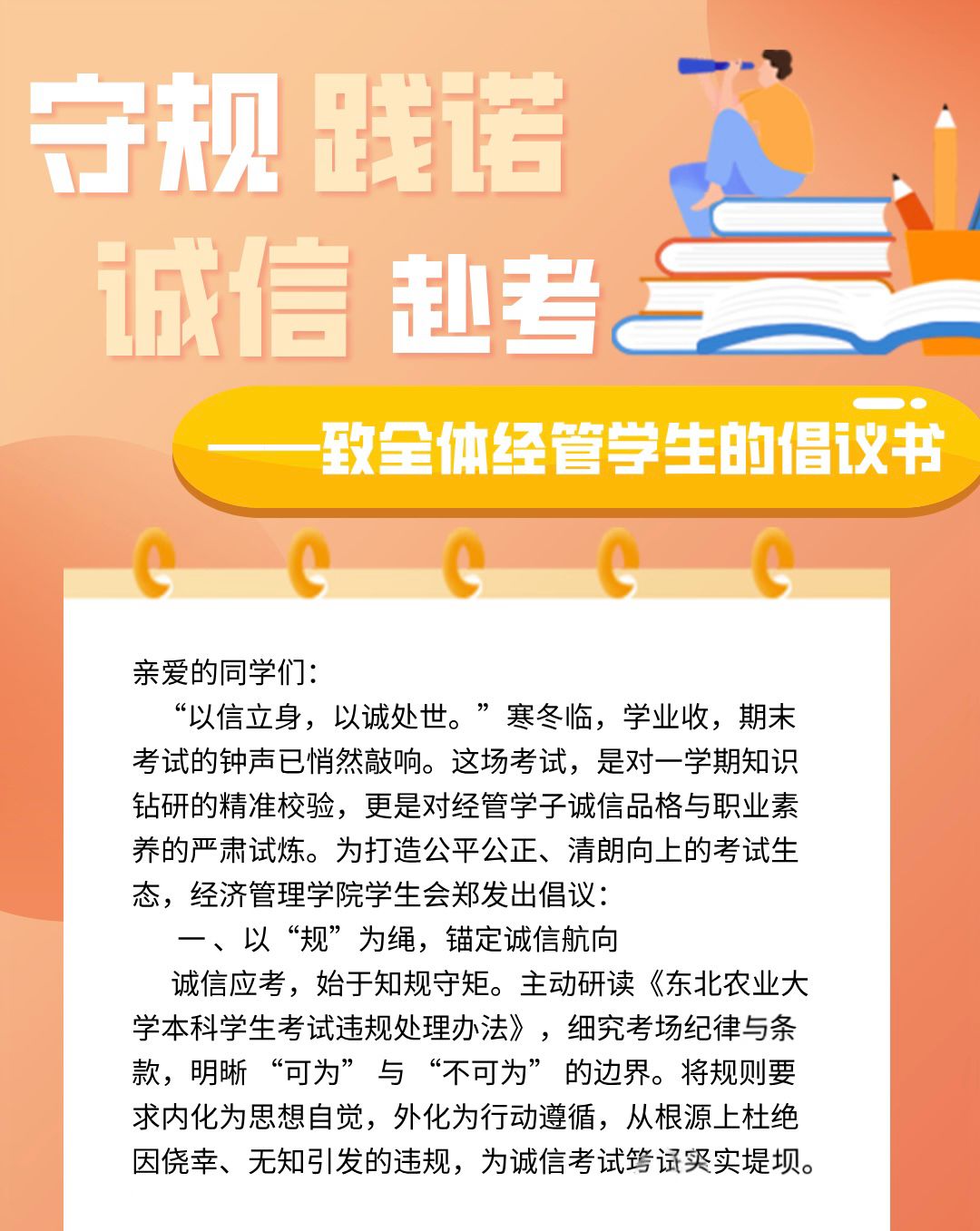为强化考前纪律意识,学院聚焦诚信考试教育,召开考前诚信教育主题宣讲大会,为学生敲响诚信警钟,引导大家敬畏考试规则、坚守学术底线。开展学生手册培训大会,围绕学生手册中考试违纪处理办法、学术诚信规范等核心内容进行详细解读。举办“学册为镜,笃行致远”学生手册知识竞赛,强化学生规则意识、责任意识与自律能力。同时,学院通过东农经致青年微信公众号发布《诚信考试倡议书》,向全院学生发出“严守考纪,诚信应考”的号召,营造出浓厚的诚信考试氛围。