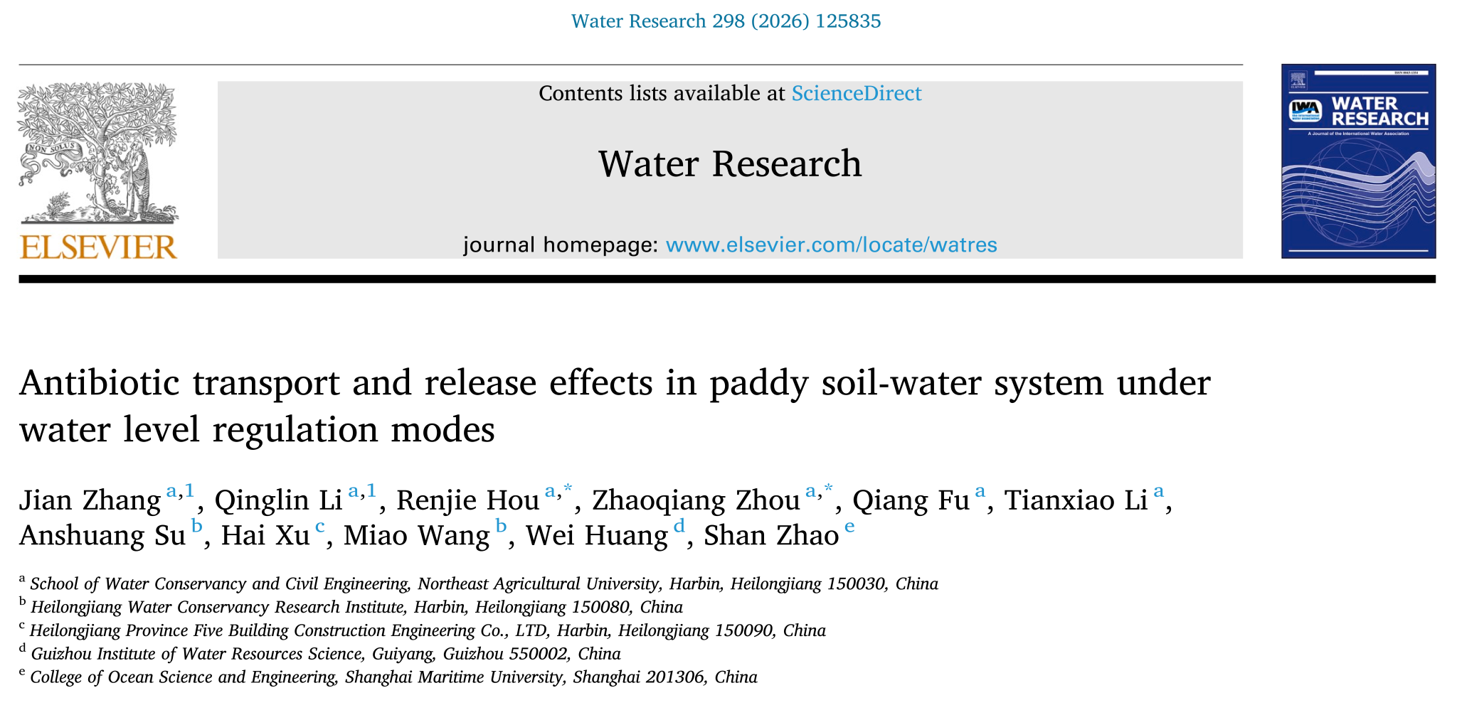 近日,我校水利与土木工程学院付强教授团队侯仁杰教授课题组在水资源领域顶级期刊《Water Research》(影响因子12.4)发表题为“Antibiotic transport and release effects in paddy soil-water system under water level regulation modes”的研究论文。该成果创新构建了考虑地表平整度影响的抗生素传输通量预测模型,解析了灌排联动背景下水位调控对溶质沉积-释放的动力学机制,揭示了水稻各器官中抗生素累积富集阻控效应,该研究为更有效地开展稻田污染防控提供了重要的科学依据。
