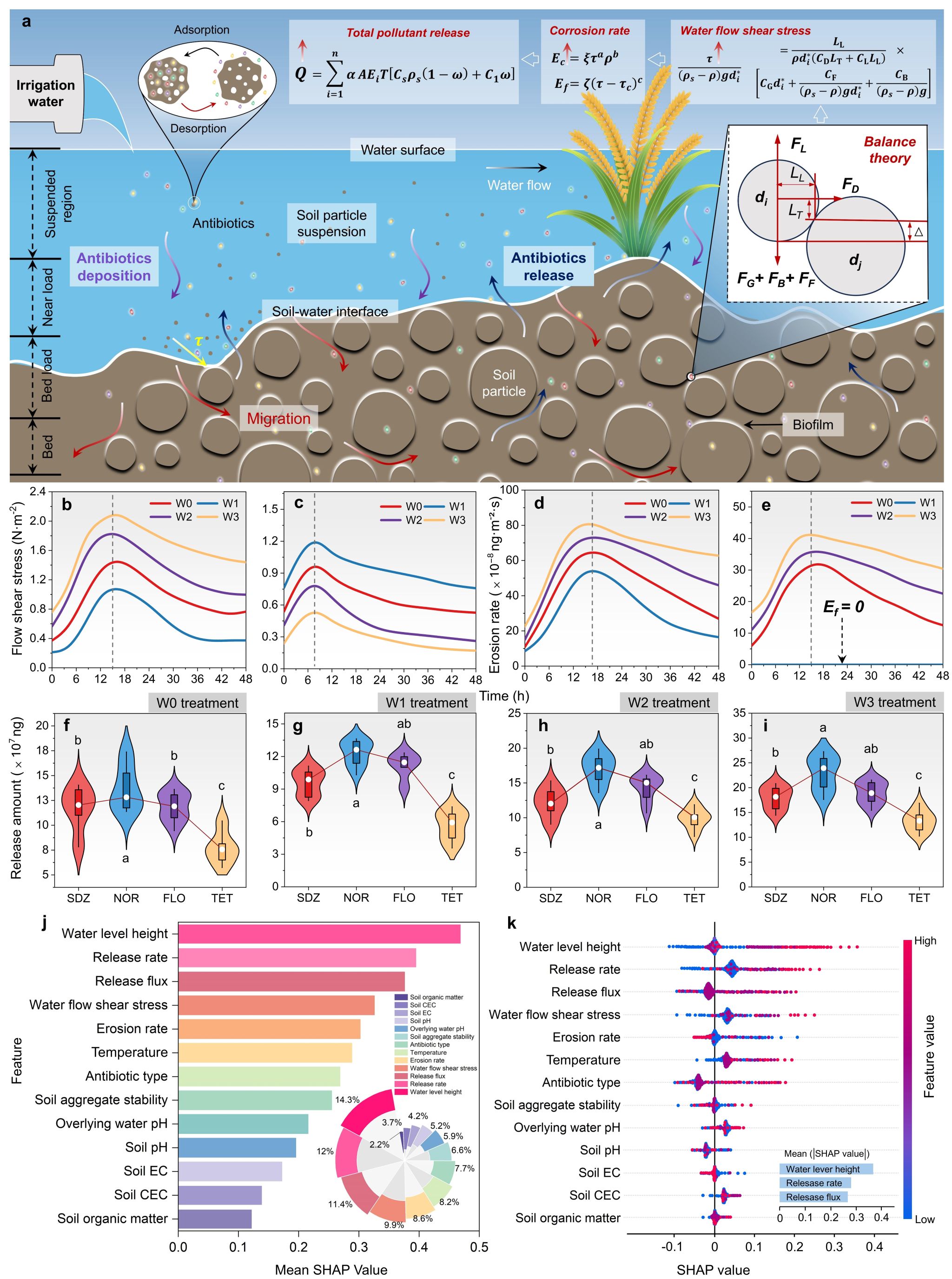 抗生素通过污水灌溉等途径进入稻田系统,其易富集、难降解的特性不仅严重破坏了农田生态系统稳定性,更通过食物链迁移威胁人体健康,成为危害农业绿色可持续发展的重大隐患。稻田作为水陆生态系统的关键界面,灌排水流运动是抗生素迁移释放的核心驱动力,但目前灌排过程中稻田土-水界面抗生素的沉积-扩散动力学机制仍未得到系统解析,制约了农业绿色灌排耦合调控技术模式构建。本研究改进了考虑吸附-解吸过程的抗生素沉积-释放速率测算理论,定量表征了灌排过程抗生素土-水界面交换机制;整合了阻力系数、水稻种植密度及平整度参数等因素,创新构建了非理想状态下土水界面抗生素沉积-释放模型;基于活化能、化学降解及光解耦合过程,提出了污染物释放总量计算理论;优化了基于全生育期动态水位阈值的调控方案,同步实现了灌溉节水、产量稳增、籽粒抗生素阻控及面源污染排放削减的多目标协同效益。